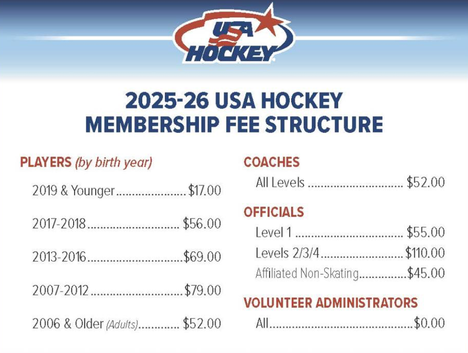 Every parent registers a child (or family) with a one-time $250 addition that can be returned at end of season if volunteer hours are met. Learn to skate program is Free with no added costs.